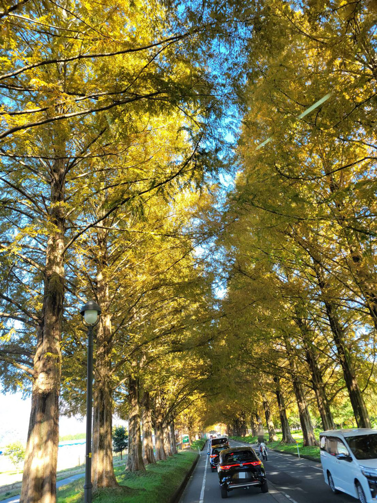 メタセコイヤ並木の紅葉は先週よりも色づいていたものの、まだピーク手前。