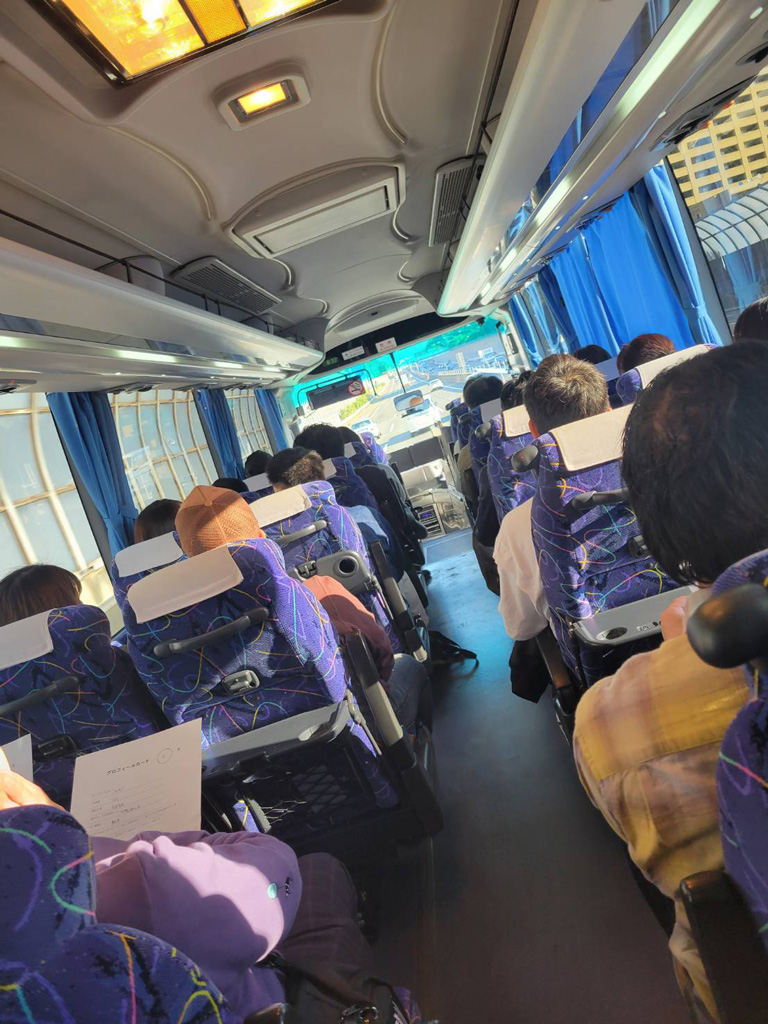 たくさんの参加者でバス車内はにぎやかに出発しました🎵