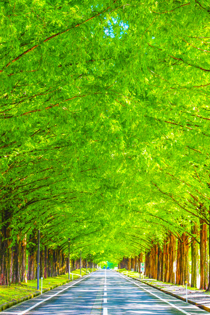 約500本のメタセコイヤが約2.4kmにわたって続く、美しさと爽快感あふれる並木道。