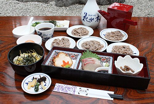手打ち皿そば5皿/薬味一式(たまご・やまいも・大根おろし・ねぎ・わさび・きざみのり) /刺身/炊き合せ/小鉢(酢の物)/かやくご飯または山菜ちらしずし/香物